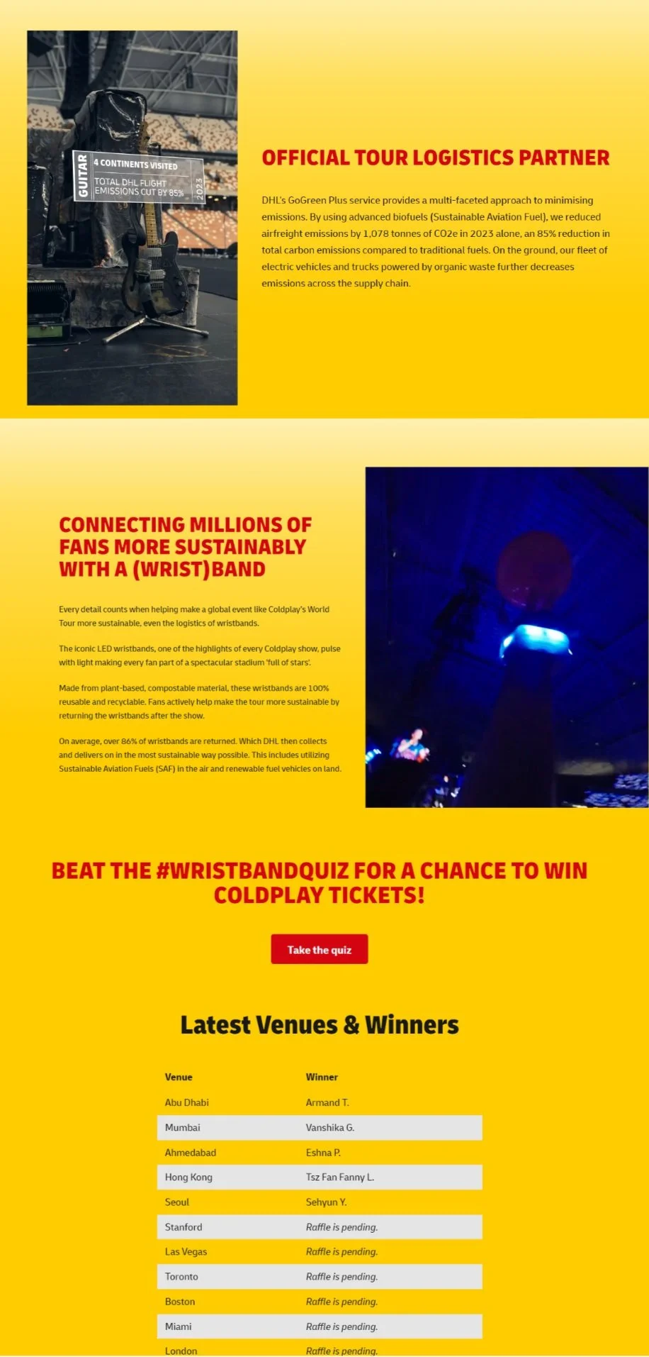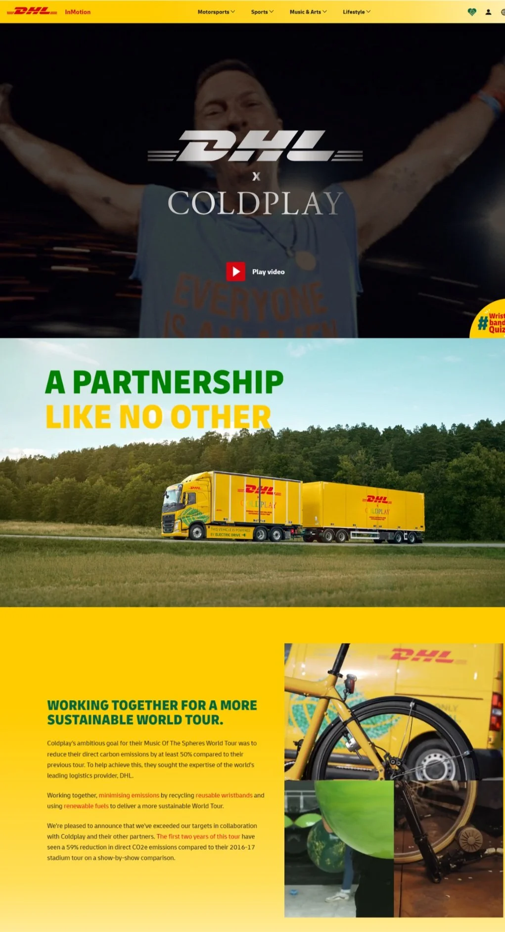 This campaign celebrates worlds colliding. It’s a stylized dance between synchronized visuals of Coldplay concert footage and the sustainable DHL initiatives that enable the tour. Coldplay’s world tour and DHL’s logistics hub may be separate entities, but they thrive off one another, and that’s the story we tell in this commercial. A film that foregrounds the essence of the partnership itself. Directed by Ryan Staake and filmed in Singapore.